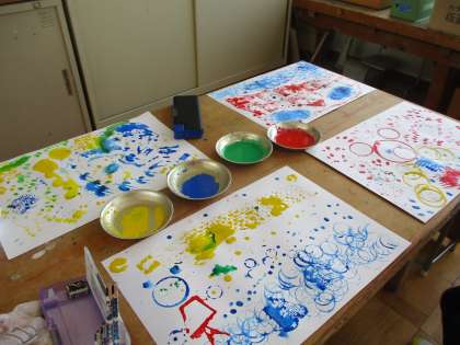 いろいろな形のものに絵の具をつけて版画をしました。形をつなぎ合わせたり,たくさん押したりして楽しい形を作っていました。材料集め,ありがとうございました。