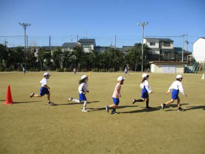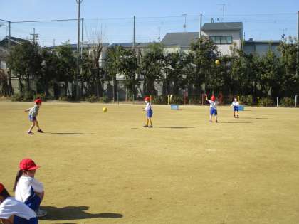 運動場で,ゆっくりかけあしをしたり,ゆうぐあそびをした後,パスあそびをしました。二人組になって,ゴールまでパスをしながら進んでいきます。回数を重ねると,素早くボールできるようになってきました。