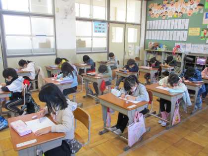 かん字の小テストを始めました。満点をとろうと真剣にがんばっています。