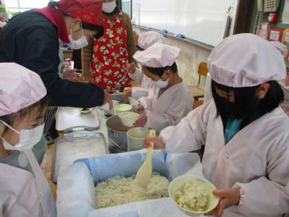 給食当番がみかんグループになりました。おかずもごはんもよそうのが上手です。