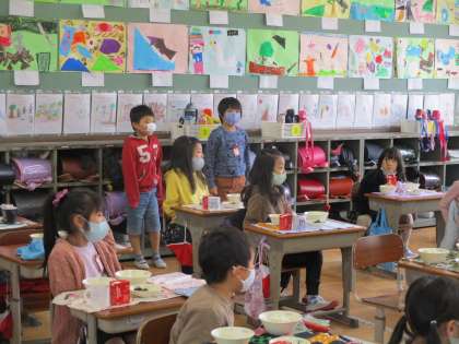給食のメニューを言う給食係が新しくなりました。ごはんやおかずの並べ方もしっかりと伝えてくれました。