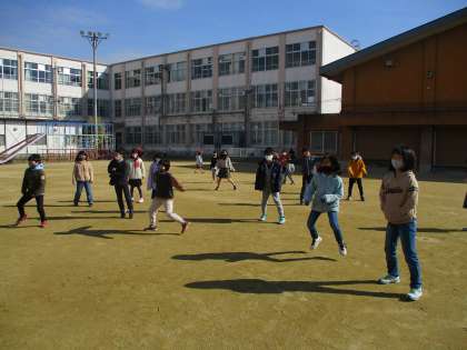 日差しがとても暖かい中間休み。今日は,遊び係のお友だちが中心になって『みんな遊び』でドッジボールをしていました。体を思いっきり伸ばしていました。