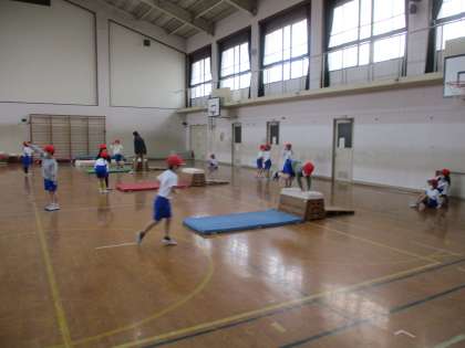 とびばこあそびをしました。「とびのり・とびおり」「またぎのり・またぎのり」で,手をとびばこの奥の方につくことに気をつけて練習しました。