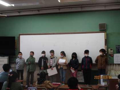 6年生送る会の実行委員の人達が,提案しています。自分達だけでよく考えられています。