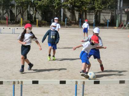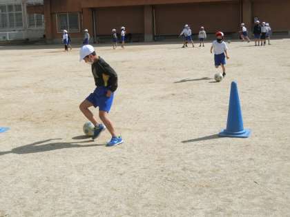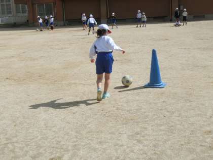 2年生の体育では,サッカーがはじまりました。これまで続けてきた,パス練習を生かして試合をしました。声を掛け合い,試合を楽しみました。また,ドリブルでつなぐリレーも行いました。