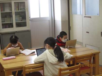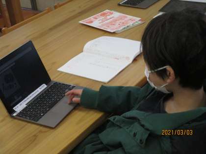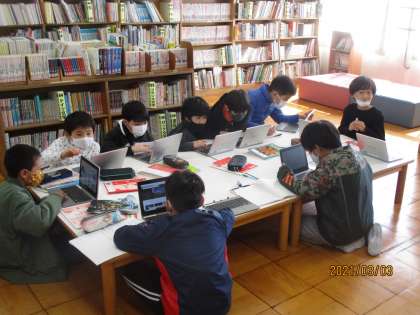 タブレットや本を使って自分で決めたテーマについて調べています。