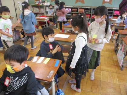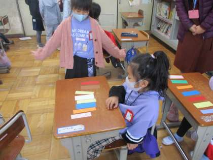 今日は,色カードのお店屋さんごっこをしました。もらったカードの色でちょうちょの色を塗ることができるため,いろいろな色を英語で言ってカードを上手にもらっていました。