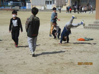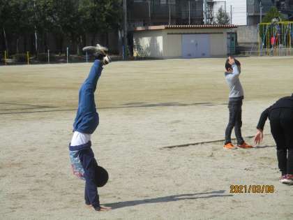 砂場で逆立ちをしていました。5秒できる人も出てきました。気を付けて遊んでください。