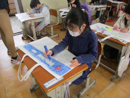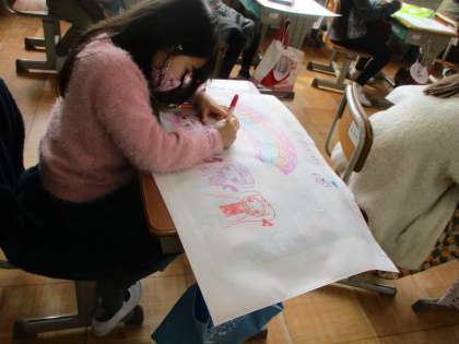 一年生で描いた絵を入れるための作品バックに一年生の思い出の絵を描きました。「とびばこあそび」や「夏見つけ」など楽しい絵をたくさん描いていました。