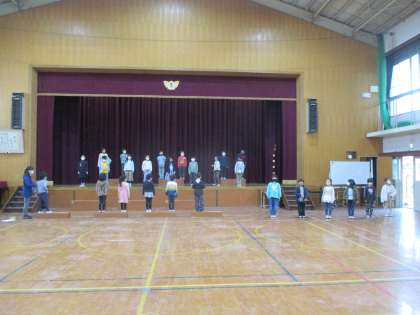 体育館で練習をしました。すらすら発表できるようになったのですが,今度は間を開けることを練習しました。