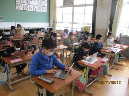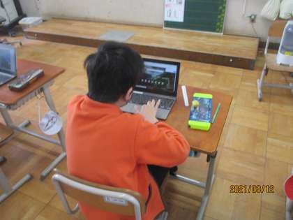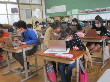 宮津市のチラシを作るために,パワーポイントに画像を貼り付けたり,保存したりする方法の練習をしています。