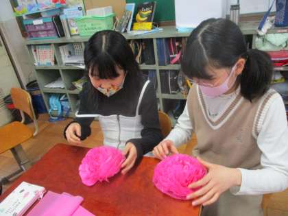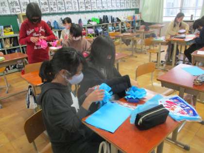 6年生の卒業まであと少しです。卒業式に向けて,校内の飾りつけをしています。5年生は花紙のお花で虹を作ることにしました。気持ちをこめて,ていねいに取り組んでいました。