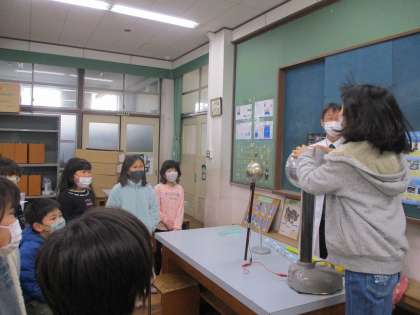 今日の理科は,校長先生の授業で『静電気』について学習しました。いろいろな実験で静電気を発生させたり,静電気発生装置でその正体を見せてもらったりしました。最後には,発生装置に触って髪の毛が逆立つ様子を体験したりして,楽しく学習しました。