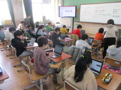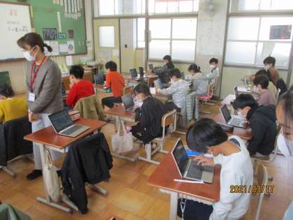 パワーポイントも慣れてきてレイアウトを考えたり,文字の配置や大きさ,色を考えたりできてきました。宮津市を終えた人は舞鶴,宇治,京都市と取り組んでいます。子どもの順応性に感心です。