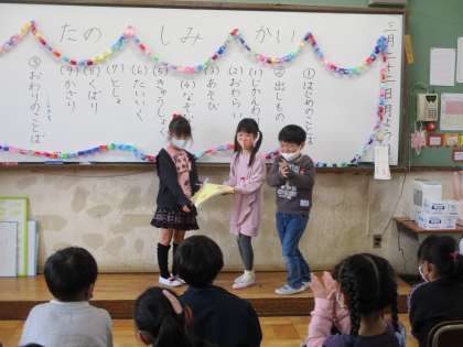 くばり係のなぞなぞ,かざり係の飾り紹介と折り紙劇が続きました。その後は,転出するお友達にみんなからの手紙を渡しました。手紙を書いていたことに全く気づいていなかったということで,みんなのびっくり作戦大成功でした!