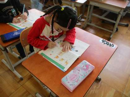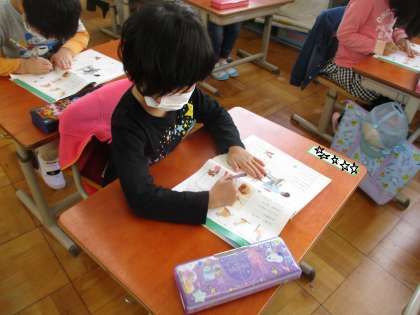 12日,初めての国語です。えんぴつの持ち方を学習しました。えんぴつをつまんで,中指をまくらにします。上手に持てたのですが,線を書くときになると,そのまま書くのは難しいようでした。何度も練習をして正しく持てるようになりましょう!