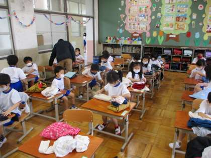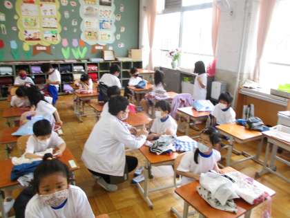 初めて体育服に着替えました。身体計測のためです。みんな素早く着替えて,脱いだ服も上手にたたんでいます。