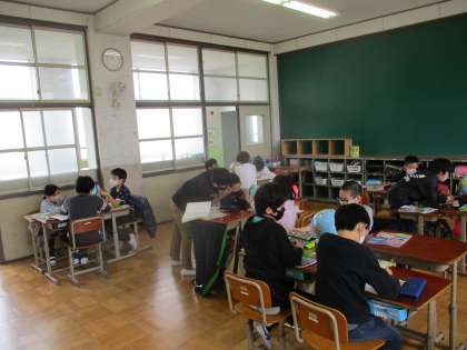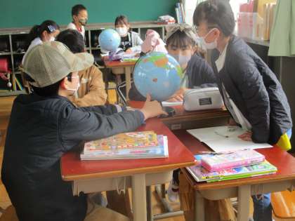 初めての学習…地球儀を使って気付いたことを話し合っています。