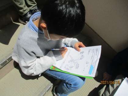 桜の木を観察してカードに書いています。