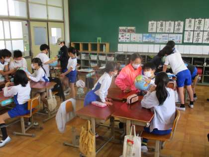 社会科の授業では「地球儀の使い方の学習にたくさんの時間を割けないため,朱桜タイムを活用して社会科で学習した地球儀の国と国の距離を計測を行いました。
