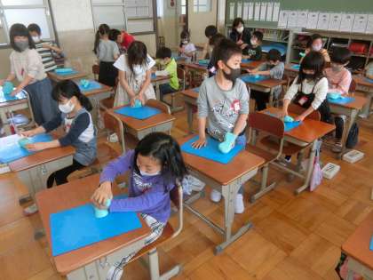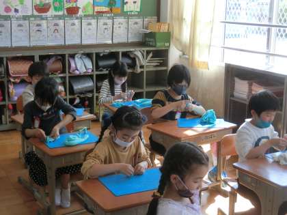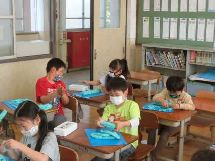 2年生の図工では,粘土を使った学習を行いました。粘土でひもを作って,そのひもを使い,名前を作りました。次は,指の形を使った作品作りを行いました。楽しく粘土をこねていました。