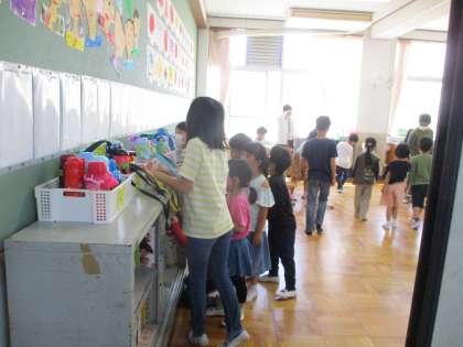 掃除の時間,今日も6年生が来てくれました。今日は,ゴミ捨てに1年生に行ってもらいました。そこで,5年生が捨て方を丁寧に教えてくれました。やさしい6年生と5年生です。
