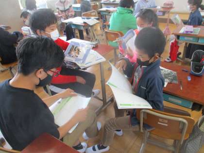 自分の考えを3人組で交流しています。