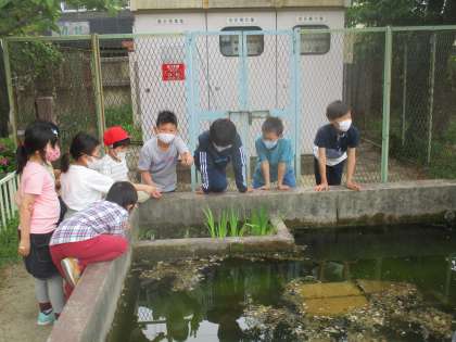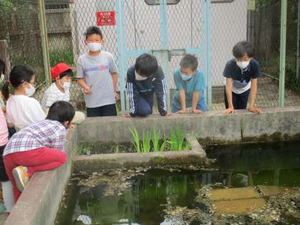 下の学年と一緒に生き物を探しています。ステキな光景でした。