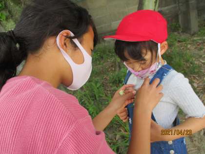1年生が外遊びができるようになり,一緒に楽しむ様子が見られるようになってきました。ボール遊びをしたり,おにごっこをしたり・・・。名札にシロツメクサをつけてあげる,ほのぼのした場面もありました。