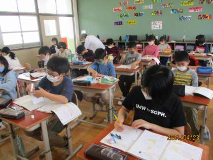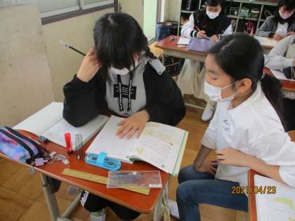今日は,点対称の図形のかき方を考えました。前回に学んだ点対称の性質を使って,かくとよいことがわかりました。うっかりすると線対称になってしまう子もいましたが,対称の点を意識するとかけるようになっていました。最後に,オリジナルの点対称の図形をノートにかきました。複雑な形を工夫しながら一生懸命に取り組んでいました。