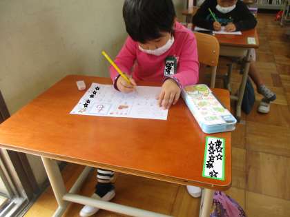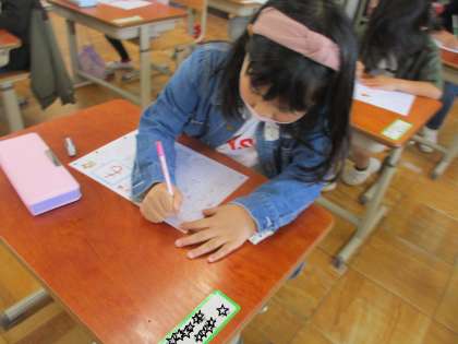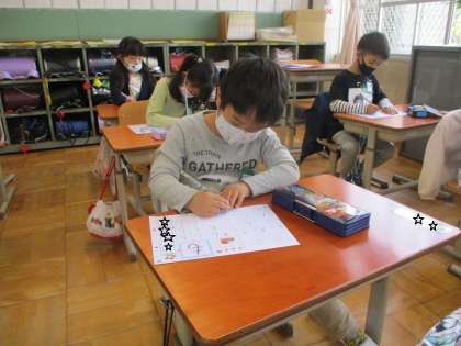 昨日学習した「し」よりも書き始めがななめになっていて,一画目のはらいの向きも違うことを学習しました。丁寧に練習することができました。