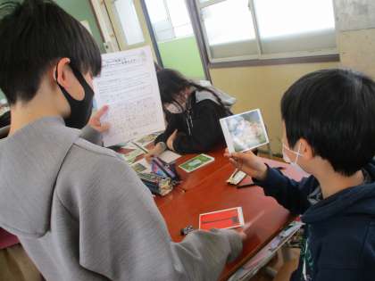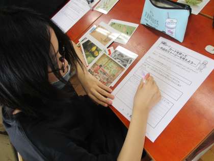 美術作品のカード40枚をじっくり鑑賞した後,自分のお気に入りを選んだり,選んだカードからストーリーを作ったりしました。1枚から想像を膨らましたり,数枚をつなげてみたり,面白いお話がたくさんできました。友達との交流も楽しそうでした。実際の作品を見てみたいと思った子も多く,美術館に行くきっかけになるといいかもしれません。
