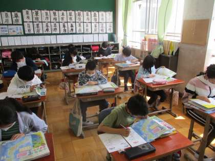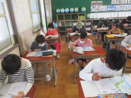 地図帳などを用いて,日本の地形をまとめています。がんばれ!!