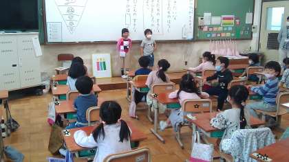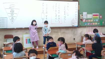 友だちの「すきなあそび」を聞いて,みんなの前で友だちのことを紹介する学習をしました。声の大きさや言葉遣いにも気をつけて発表しました。
