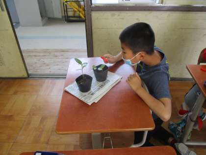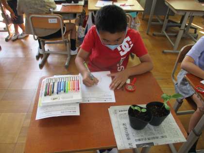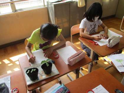 ホウセンカのなえを観察している様子です。