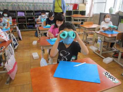 平べったくなったピザ型の粘土を,くるくる巻いてロールケーキにしました。そして,ヘラを使って2等分にしました。真ん中が空洞になっていて,双眼鏡のように覗いていました。
