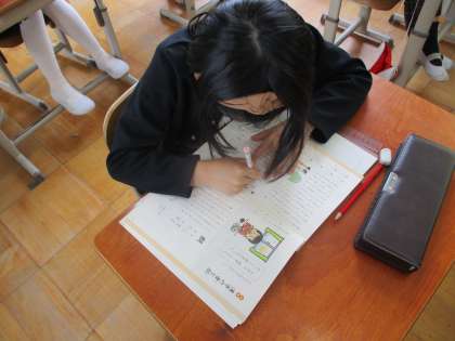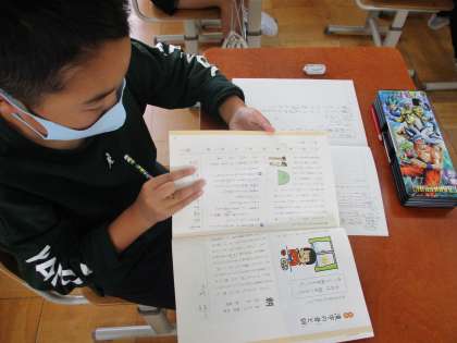 いろいろな文書に使われている漢字が音読か訓読みかを考えている様子です。