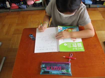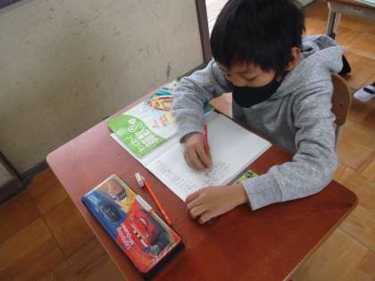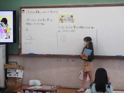 自分の考えをノートにかいてり,伝えたりしている様子です。