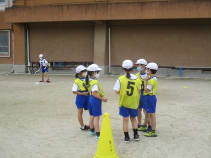 チームでバトンのわたし方を相談したり,走順を決めたりしている様子です。