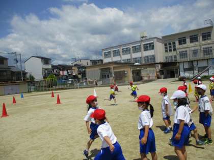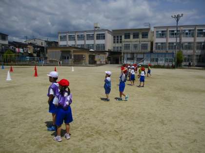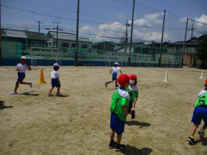 今日もリレーあそびです。2チームで対戦します。ぐるぐるリレーでコーンを回るのがとても上手な友だちに見本を見せてもらいました。すると,それを取り入れて上手に走る人が増えました。友だちパワーってすごいですね!
