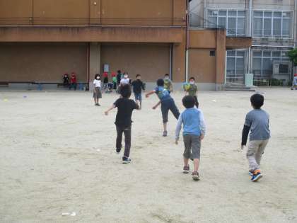 グラウンドでドッジボールをしている様子です。