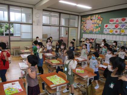 今日は,はじめに「チェッチェッコリ」をしました。3人の友だちが前に出てリーダーをしてくれました。