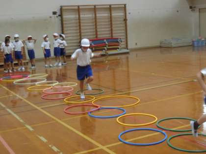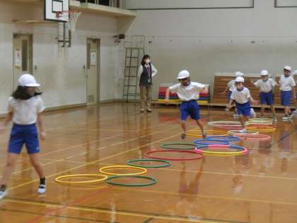 2年生の体育では,「ケンケンパ」をしました。自分たちで跳びやすく工夫した場をつくりました。