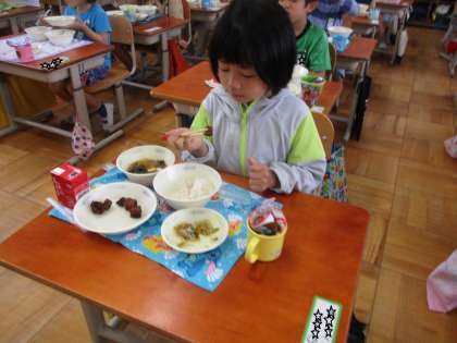 今日の給食には「鮭の塩こうじ揚げ」が出ました。みそ汁と小松菜と切り干し大根のにびたしもあり,いろいろな味を楽しみながらいただきました・。