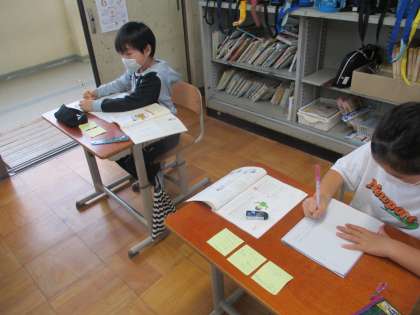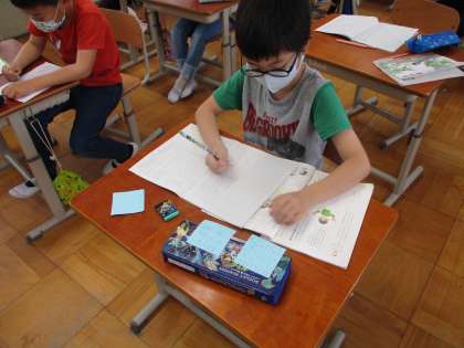 友だちの発表を聞いて感じたことをノートに書いている様子です。