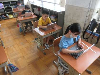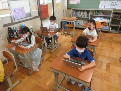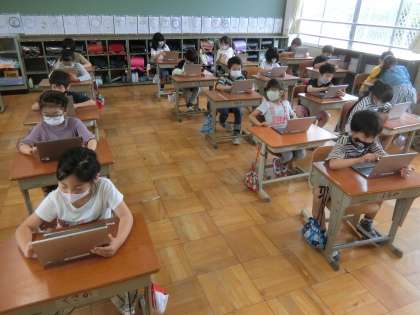2年生になって初めてのタブレット学習を行いました。画面上に絵を描いたり,文字を書いたりして,ロイロノートで提出をしました。なかなかうまくできず,苦戦しながらもあきらめずに取り組む姿が見られました。