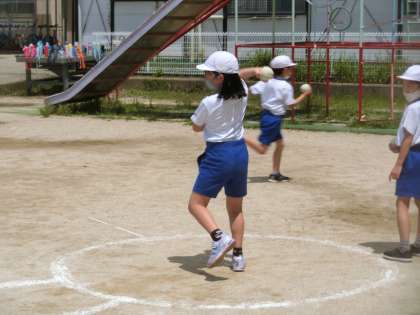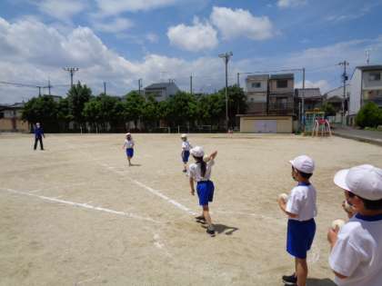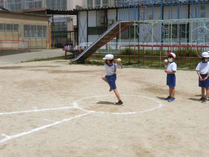 1・2年生合同で,ソフトボール投げを行いました。遠くに投げられるようにと,しっかり足を踏み込んで投げていました。