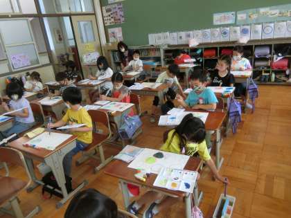 2年生の図工では,絵の具を使って「にじみ」を描きました。2色が混ざり合う様子を見て,とてもきれいだと喜んでいました。