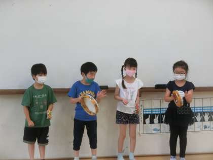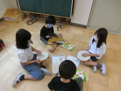 2年生の音楽では,2拍子のリズムを楽器を使って演奏しました。班ごとに,どんな演奏にするか話し合いました。