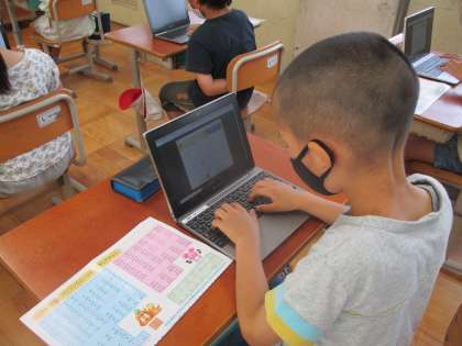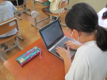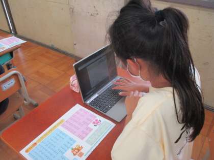 パワーポイントを使って自分の自己紹介シートを作っている様子です。